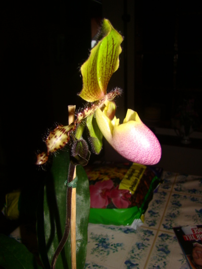 Pinocchio är osäkert. Men det är en Paphiopedilum hybrid av samma typ som Pinocchio. De rena artena växer i huvudsak på nästan lodräta klippor i naturen. De gillar ljus och vill inte stå en bit in i rummet, men aktas för brännande sol. Strax innanför fönsterbrädan i öst eller väst fungerar bra. De vill inte torka ut för hårt, så låt den inte bli fnöske torr. När man köper den här typen hos blomsterlandet är komposten oftast rätt dålig. Nedbruten och full av tusenfotingar och småsnäckor, så omplantering är att rekommendera. Den vill ha luftig kompost utan allt för mycket småskräp.